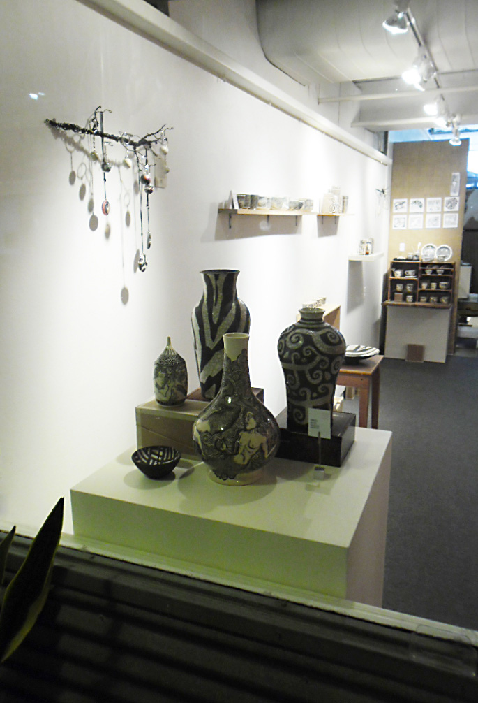 It is hard to understand the amount of discipline to both sell and produce your art in a commercial surroundings and whether the constant flip-flop between sales and client following can inhibit the concentration levels in your work. I am finding that in my first month of residency in a quieter studio , something that I now miss, it was easier to create and concentrate on my creative process and production of my work, in the second month of my residency, in a studio with more foot traffic and more sales I suffer with having to have a more disciplined level of concentration when working on my creative production. With a series of continuous interruptions stop and go btw customer’s questions and feeling like a monkey in a circus and perform for the visiting audience. stricter discipline in concentration has helped me to overcome when to focus and when to stop and follow sales. I think that this a problem of many artists as the come to grips with selling our work in a work/sell environment. multi-tasking has become the norm for many creative people who work in this style of environment and even though it is a challenge and quite different to a space with less foot traffic, it is important to discipline one self to pick and choose when to turn on or off the creative juices, in order to make a sale. The decision depends on the individual. There are times to close your studio door to deter you from distractions and customers who are really determined and attracted to your work will enter your space nonetheless. this has been my experience so far during my second month of my residency. Creative focus is something that has to be learned slowly, learning to zone out all around you, in order to concentrate on your creative process and learn to zone in when necessary. Eventually, you will learn that there are various grade of concentration and not only one level. Those who like to observe the artist at work will understand the nature of your work and will either observe and admire or admire then buy…..
