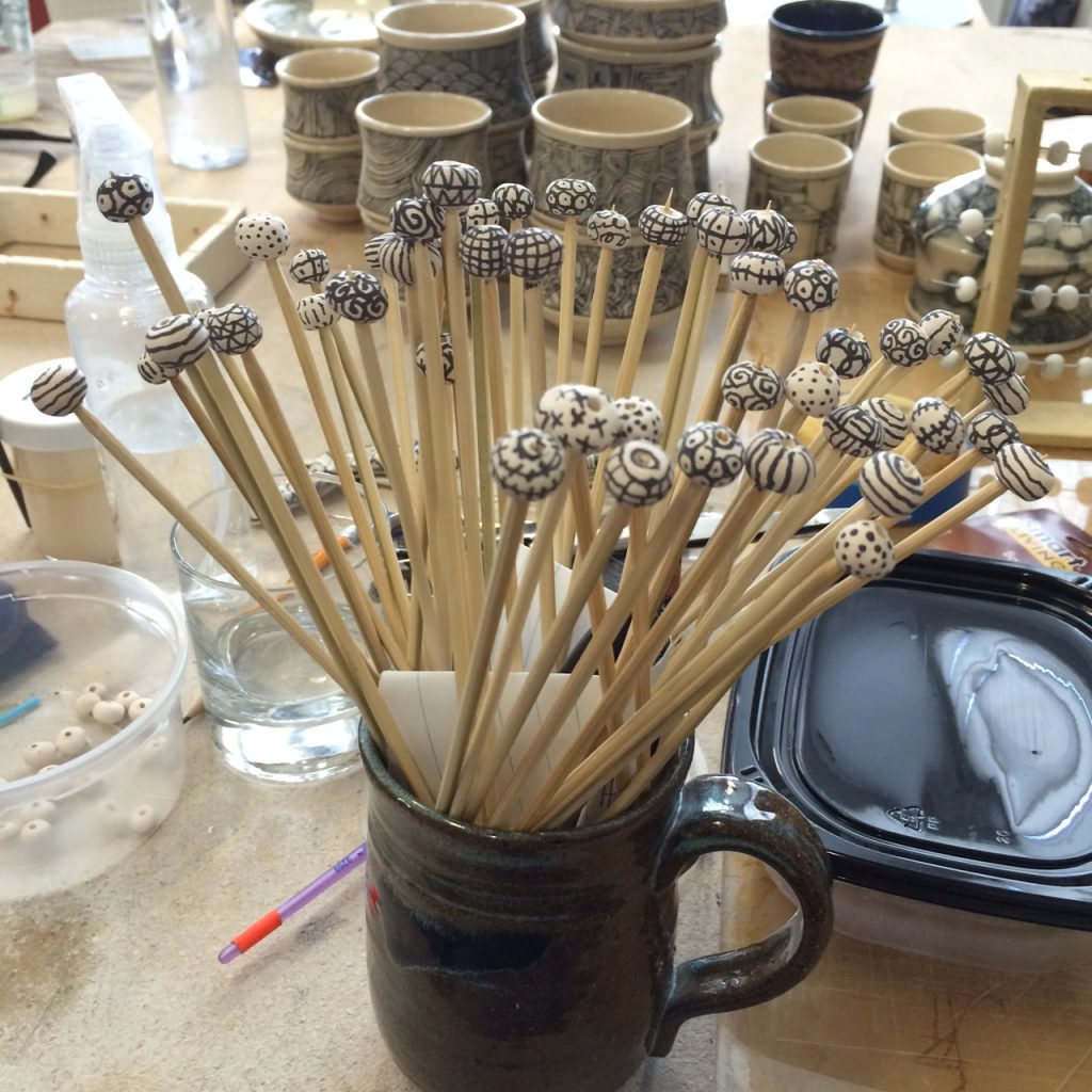 Hey there once again.. Been a while as I have been plowing away at my studio and working on some new directions with my Ceramics. August is here, and it seems that everyone except me is on vacation as visits to the studio have been few and given me the opportunity to explore new directions with the work at hand ,to develop new ideas and push the boundaries of the usual techniques that I implement in my work. (Above) you can see a picture of my hand decorated beads which I spent over a day just decorating and glazing. Meticulous and detailed oriented as I am, I sometimes wish that taking my art in to wearable art might have not been such a good idea due to the time spent painting tiny spheres to transform them into jewelry takes a lot of time and focus. It is sometime easier to decorate a large object than a small one. WHY? you ask? Sales is the answer. I have sold my hand painted jewelry and continue to make more due to the laws of Supply & Demand. GIVE the consumer or Art Lover what they are asking for….. In the same vain, I am working at the moment with a wood turner and trying my hand at high-fire firings with some other potter friends. WHY? Curiosity mostly,but also to push my work into different areas of research to try the products out on the public, to see their reaction as new way to generate sales. For Art lovers, there comes a time that as an artisan you need to provide new work in a new direction to continue to generate interest in their creative energy. Many times, too many times. I see fellow artists fall into the trap of ‘boxing themselves in to a corner’ because they think that they will continue to sell. Changing out techniques and diverse styles challenges ones self to “test the market” and to see the direct response from fellow artists, the public and a new group of consumer/art lovers. Believe me it works. I have a couple of pieces that I have done for and International Cup Show and people see it and want to buy it…. It is up to you to switch out materials and techniques once in a while to keep it interesting. DO NOT GIVE THE PUBLIC what they expect. Sales are increased when there is a bit of variety and might attract a whole different set of art enthusiasts. Take it from me who is use to playing monkey in a cage in front of the public. Customers return for the things that they know they can get from you. But do not limit yourself to the usual. Consumers crave to find something new from an artist that they follow. Never limit your creativity,it has no boundaries.You set boundaries on yourself when you become too comfortable with a certain form of creative expression or just plain lazy to push yourself to the next level or out of the usual box. Stay tuned for my new T-shirt designs that will be ready shortly and I will post the new design when they are ready for sale….. All for now.